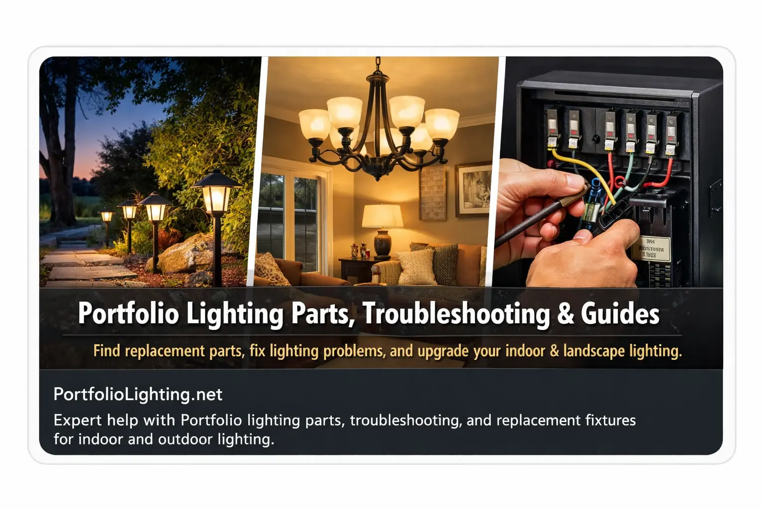 PortfolioLighting.net includes Portfolio lighting troubleshooting guides, replacement parts help, installation resources, landscape lighting information, wiring help, transformer support, and buying guides for indoor and outdoor fixtures.